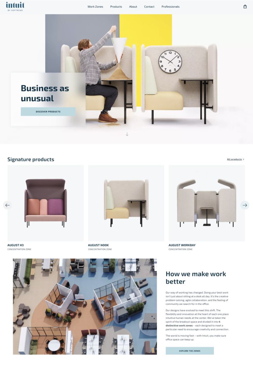 Initially, their goal with Intuit was to offer revolutionary and modern office interior solutions for businesses as a pdf document on Softrend’s e-commerce site. Since Intuit’s product range has grown rather wide and the furniture is customizable in many different ways, it seemed easier and more comfortable for the customers to shop on a completely separate webpage. Now, 10 months later, Intuit has its own e-commerce site where you can customize many details and the functionality of your desired office furniture. All their products are handmade right here in Estonia and the masters have made sure everything meets Softrend’s sustainability and quality standards.